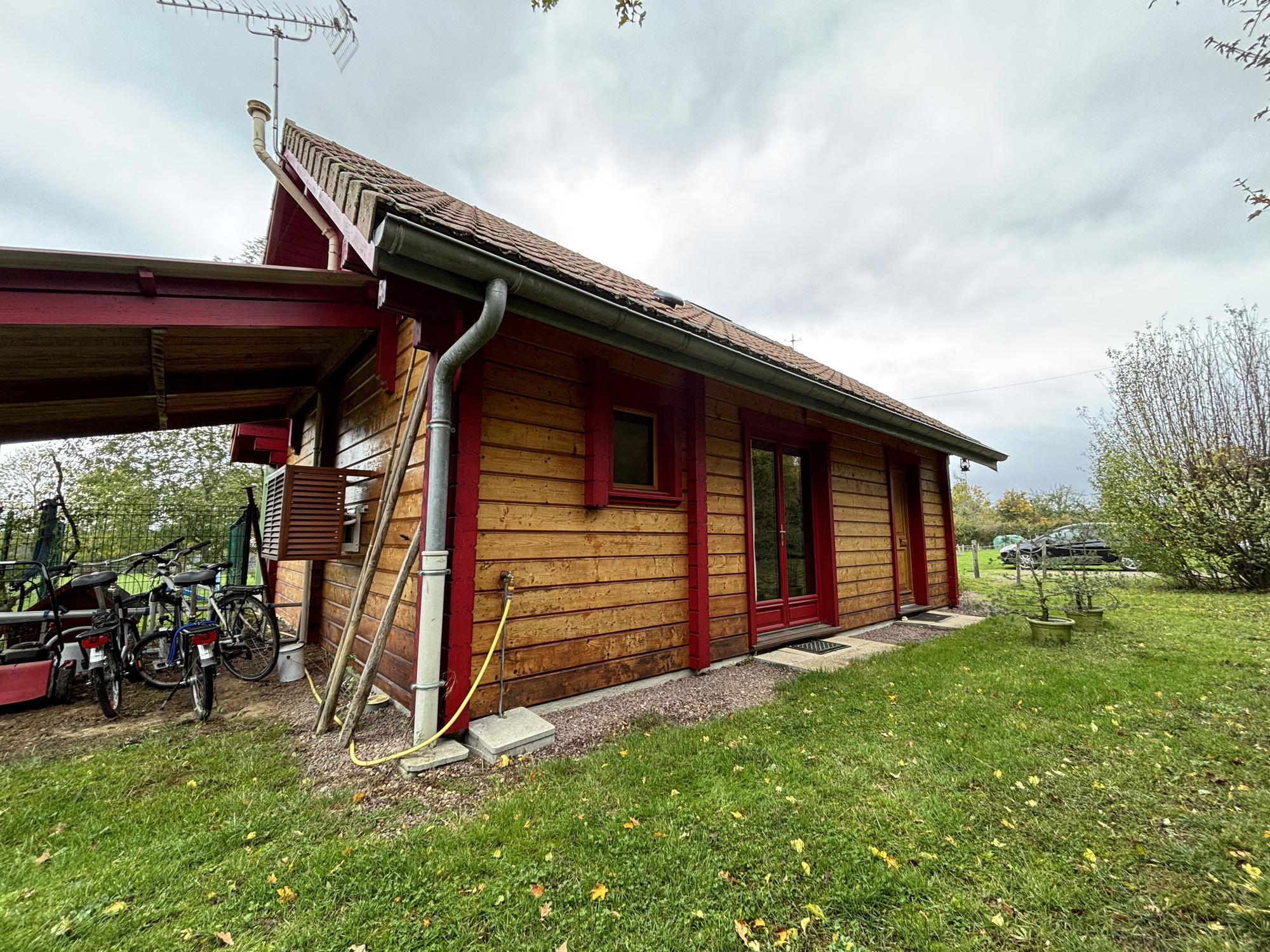 Le chalet est situé sur un terrain de 3571 m² avec une deuxième allée sur le côté et dispose d'un abri de jardin couvert à côté. Il est construit en bois contrecollé, traité avec de l'huile de bois naturelle, ce qui lui confère un aspect chaleureux et une bonne durabilité. Sur le côté du chalet, il y a un auvent supplémentaire, et récemment, un climatiseur réversible a été installé, qui chauffe rapidement le chalet en hiver et le garde frais en été.