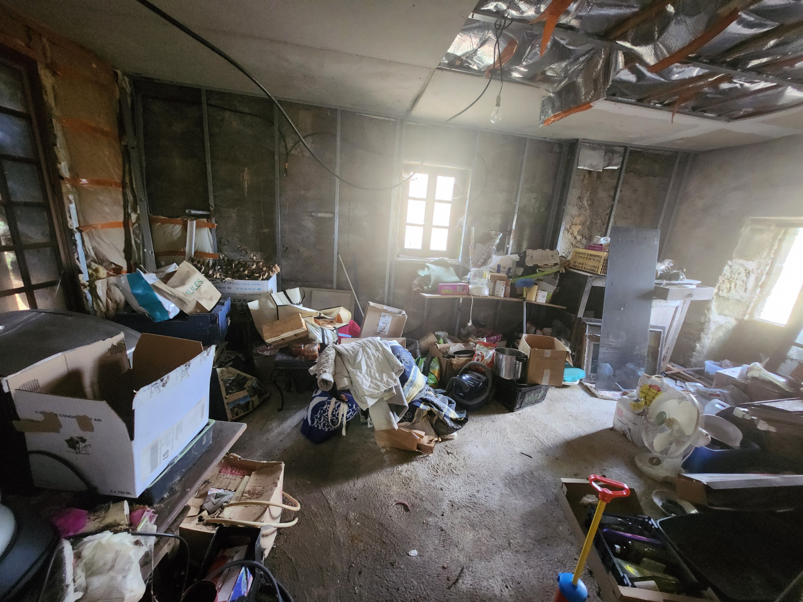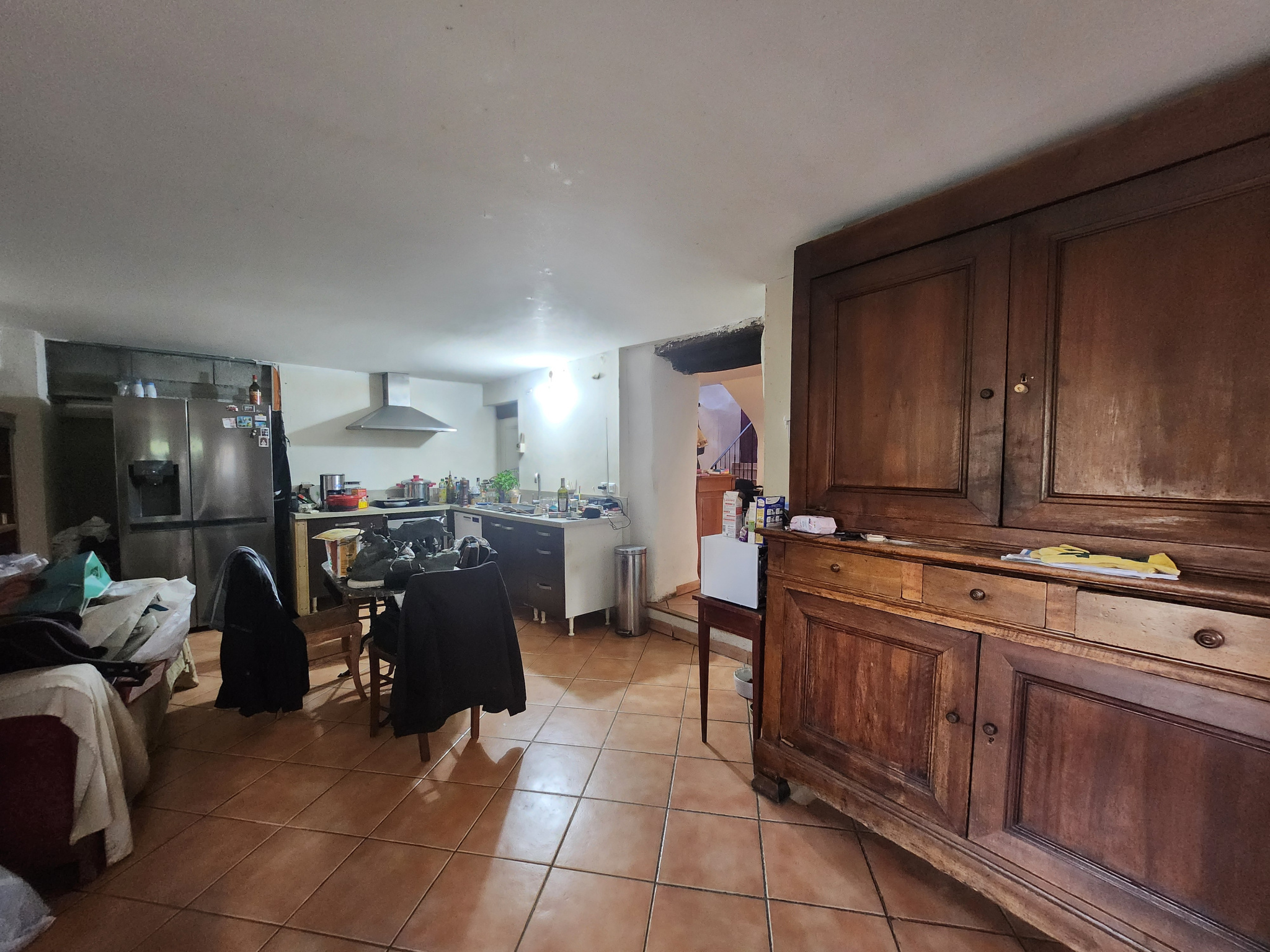 Rez-de-chaussée avec terrasse, cuisine, séjour, une grande pièce attenante à une chambre avec salle d’eau et une autre chambre à aménager.