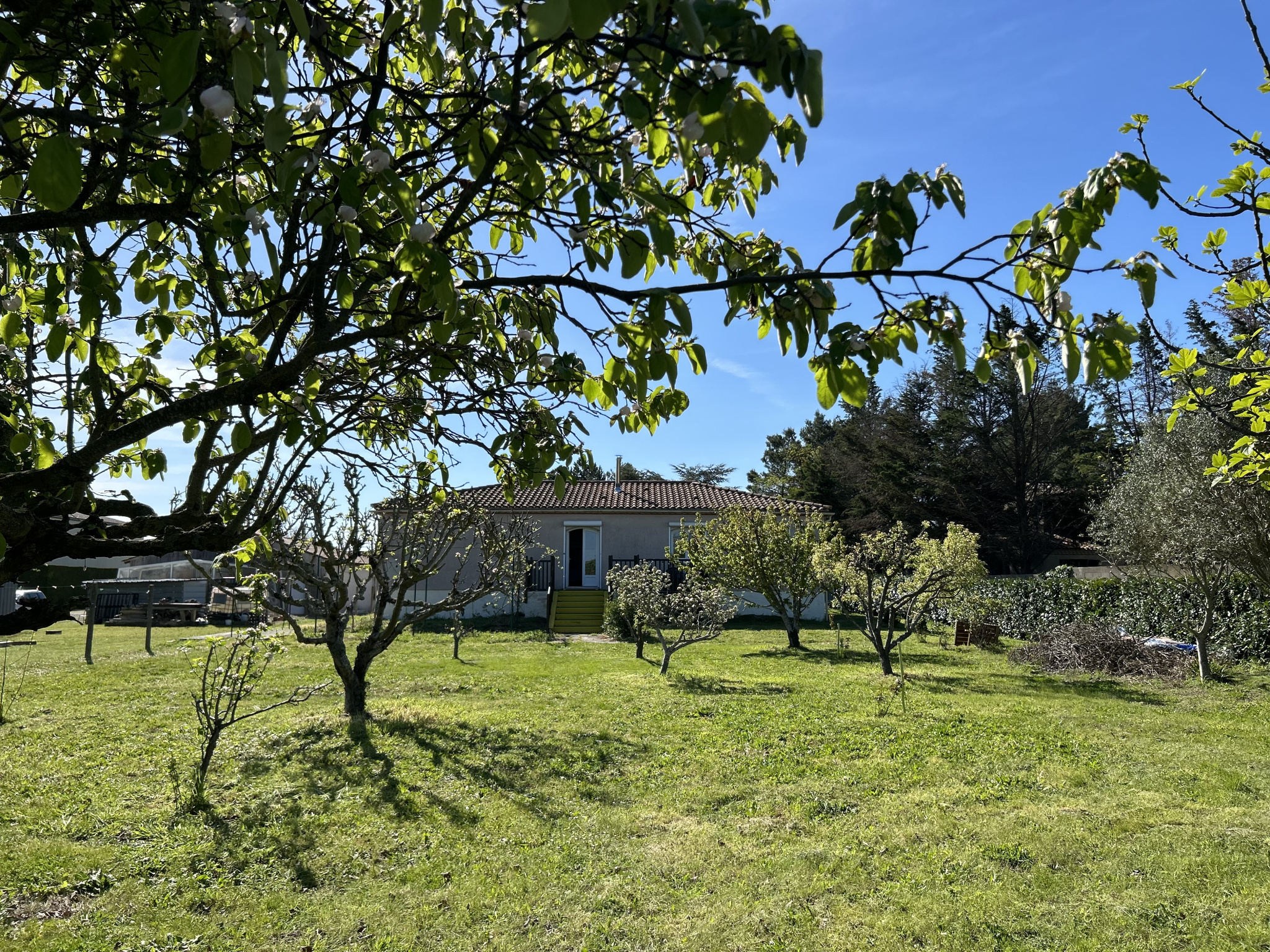 De plain-pied, reposant sur un vaste sous-sol d’environ 90 m², la maison s’ancre au cœur d’un terrain arboré de 2500m², où chaque arbre raconte une histoire : les cerisiers attendent le printemps pour vous offrir leur douceur, tandis que le figuier, patient et discret, promet des saveurs d’été. Ici, la nature est une alliée fidèle : un puits, équipé d’une pompe immergée, veille à nourrir vos jardins sans contrainte, comme un secret chuchoté par la terre.
