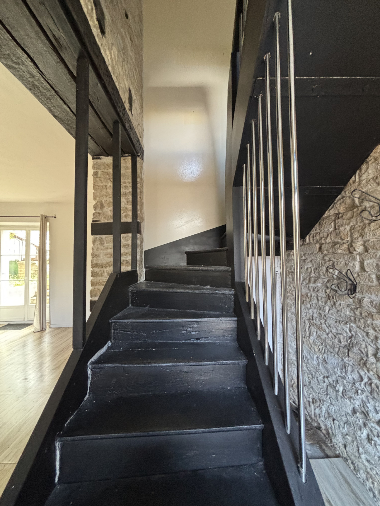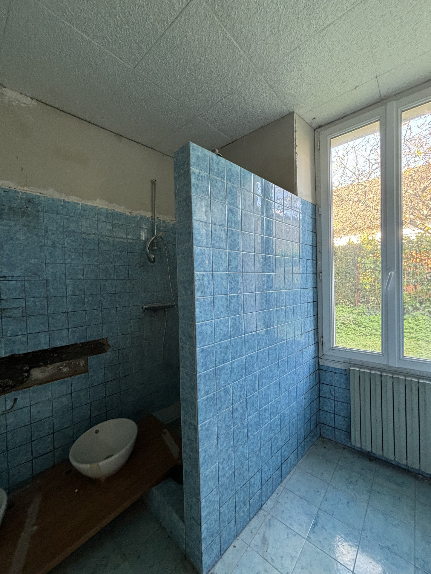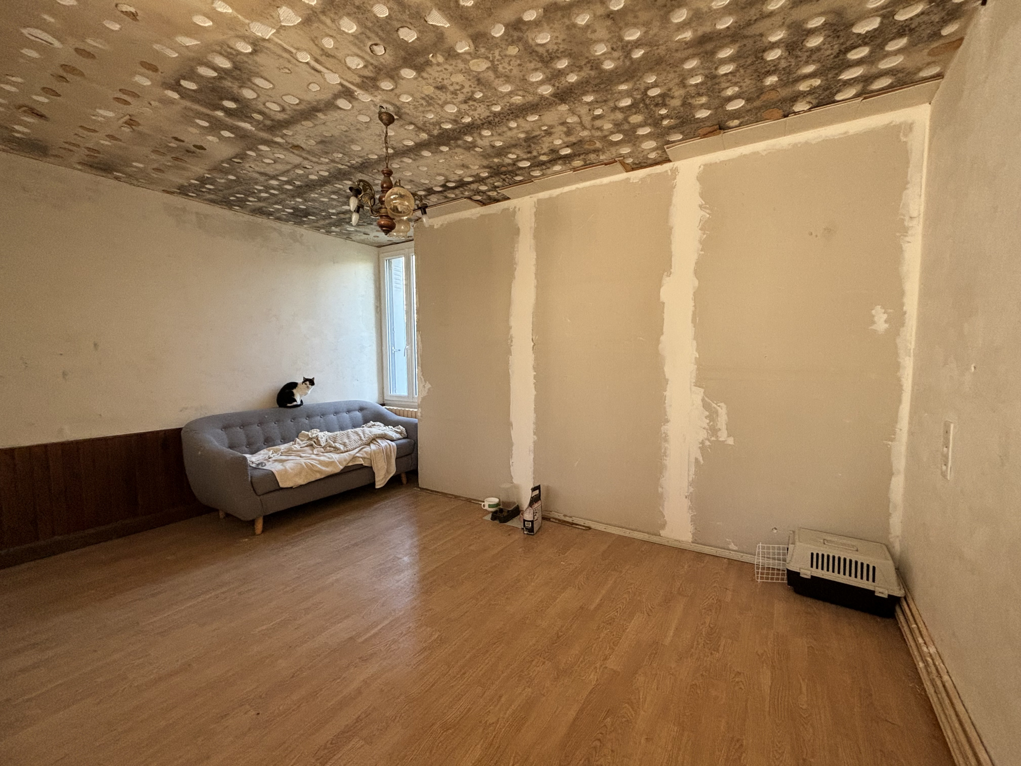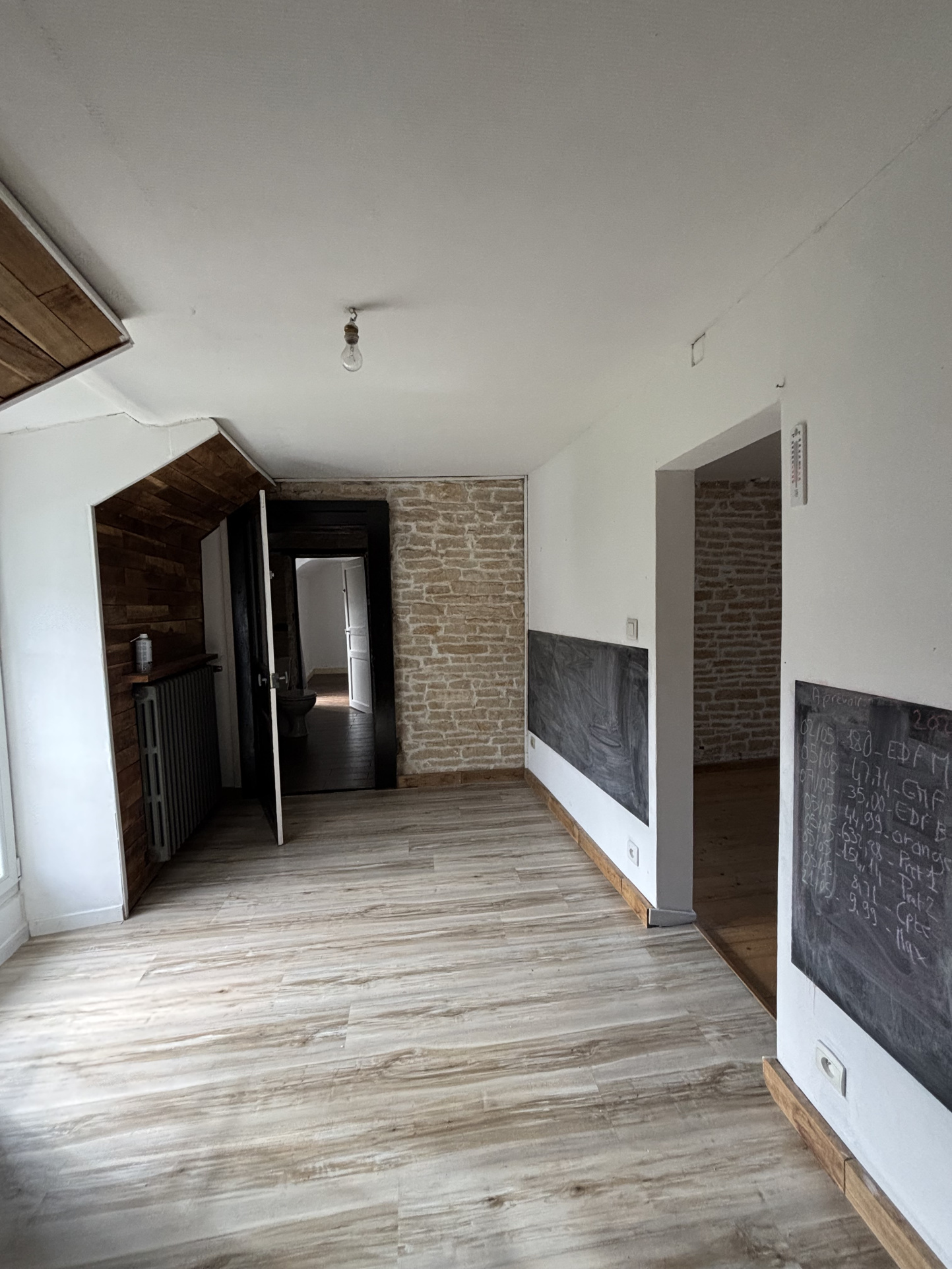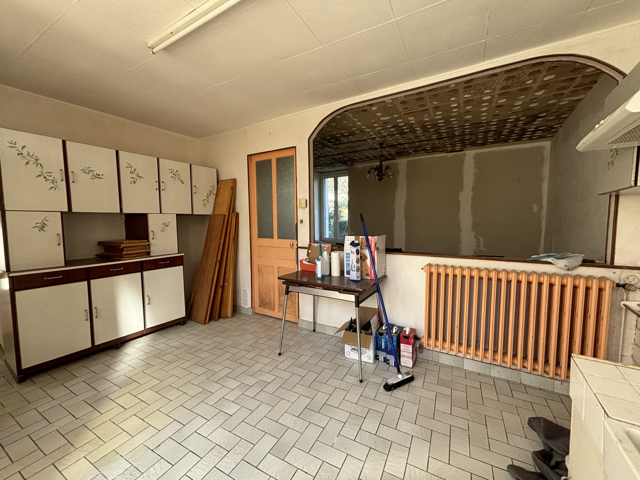 D'une entrée ( murs apparents) , une cusine moderne , une salle d'eau ,une chaufferie et un grand salon lumineux avec une possibilité d'agrandissement en abbattant le mur de la seconde maison , un insert tubé et une vue sur le terrain.