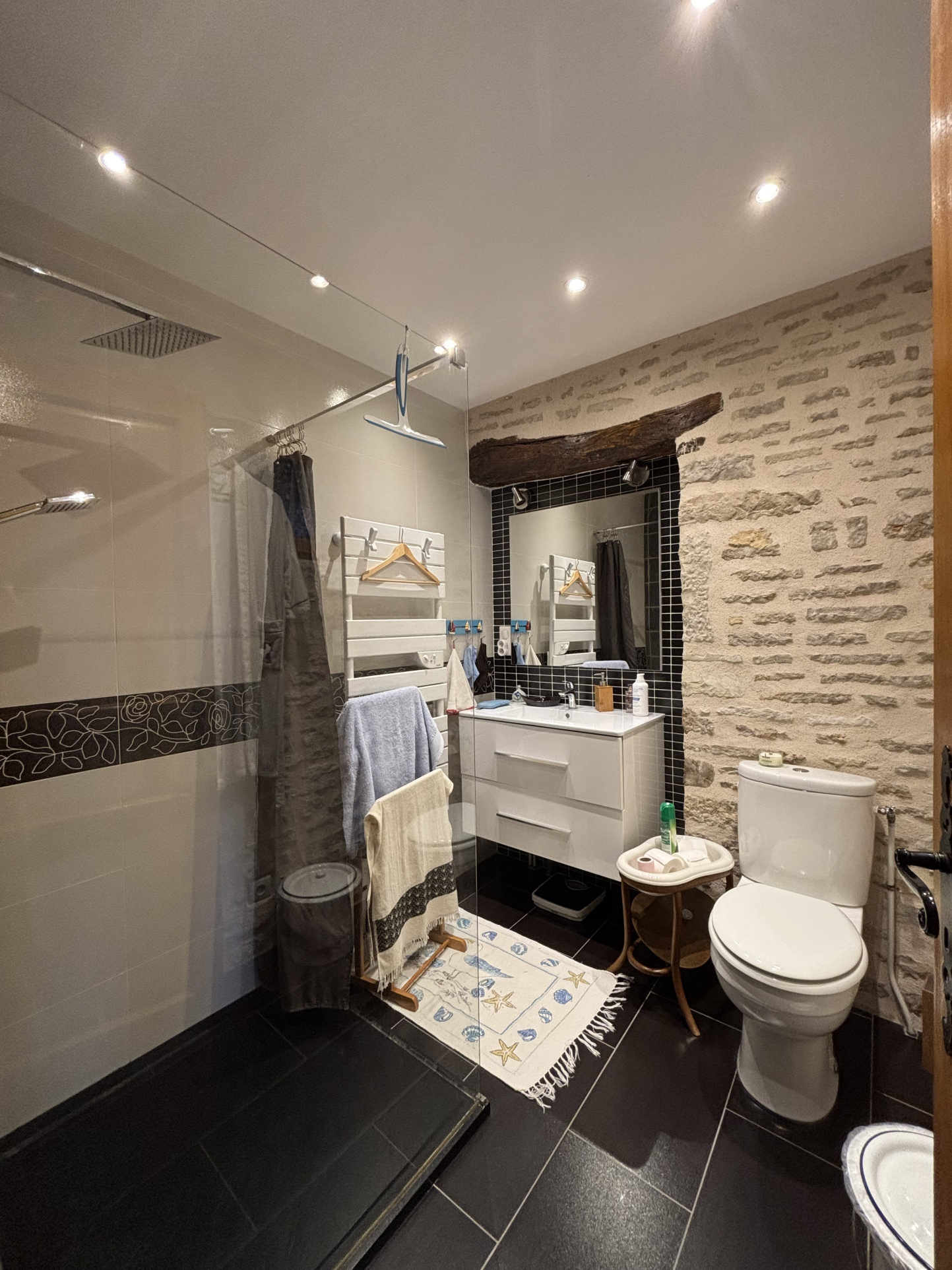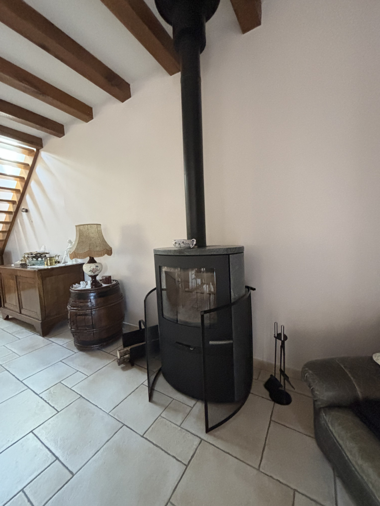 Composée en rez-de-chaussée d'un grand salon de 60m² avec mezzanine (poêle à granule et à bois ), plafond à la française, d'une cave voûtée avec accès intérieur, d'une cuisine équipée, d'un espace donnant accès à une spacieuse salle de douche.