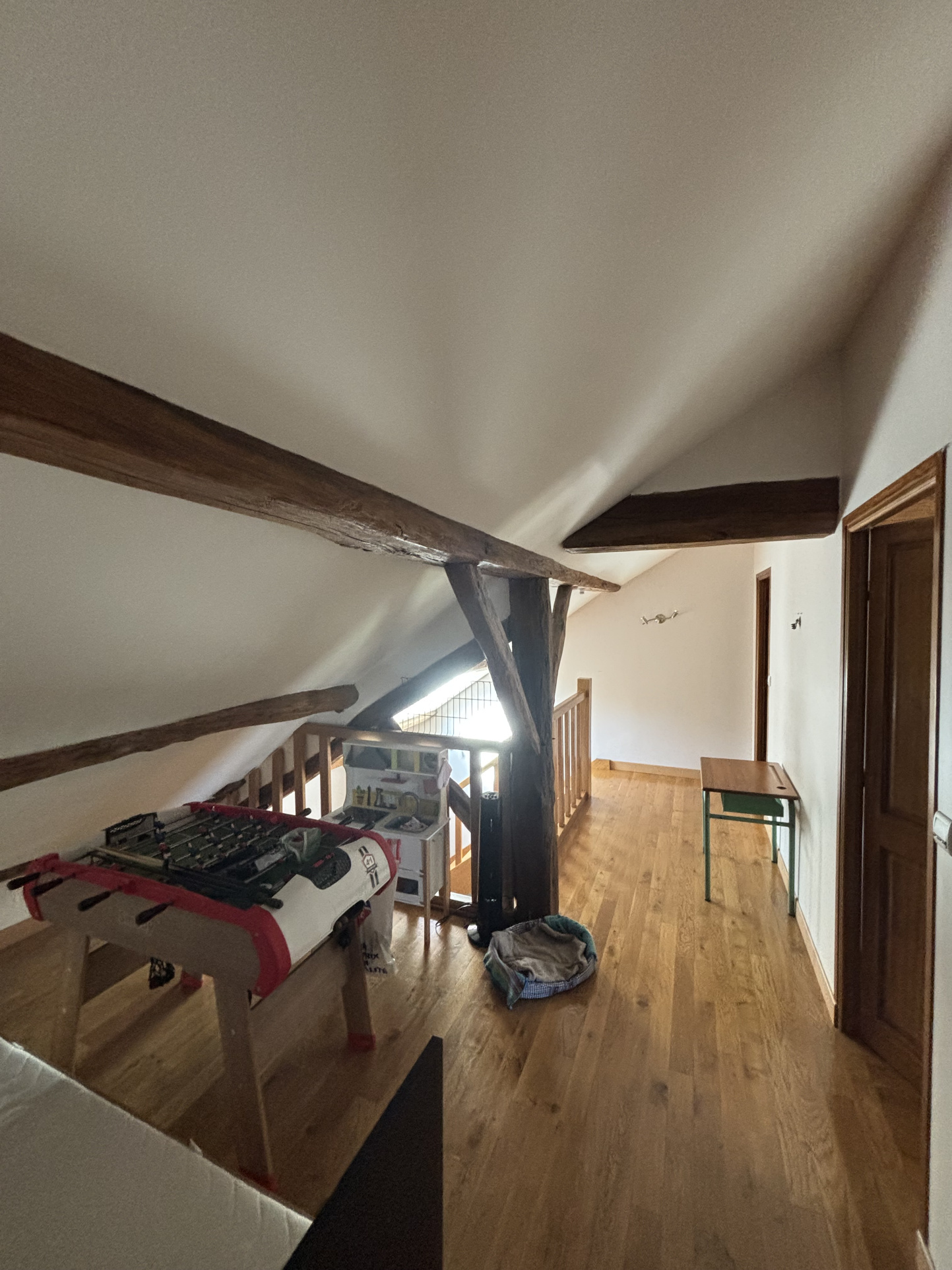 L'étage est composé de 4 chambres de 11m² à 16 m² avec placards- dressing et d'un espace ouvert en mezzanine sur le salon. Salle de bains.