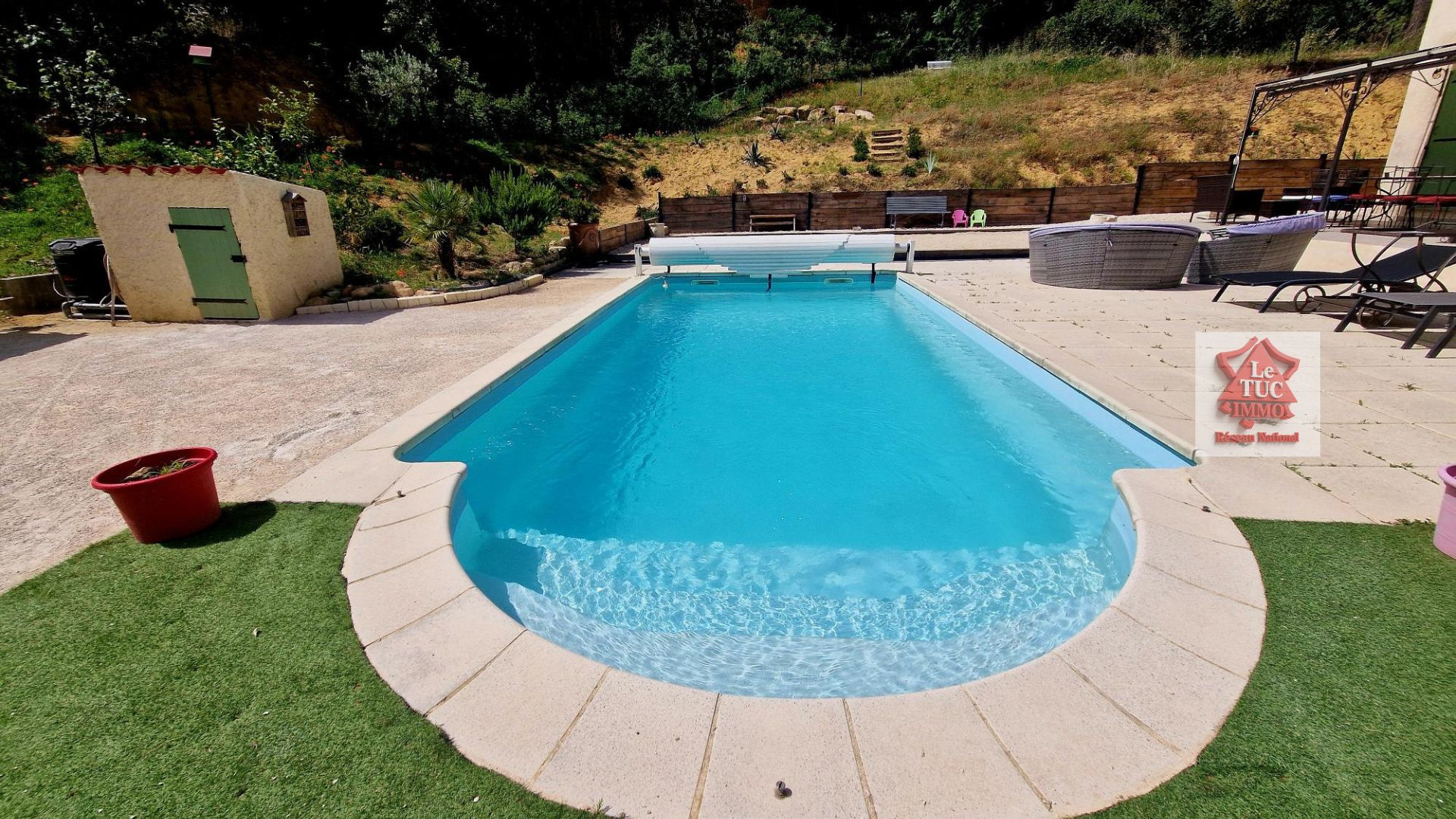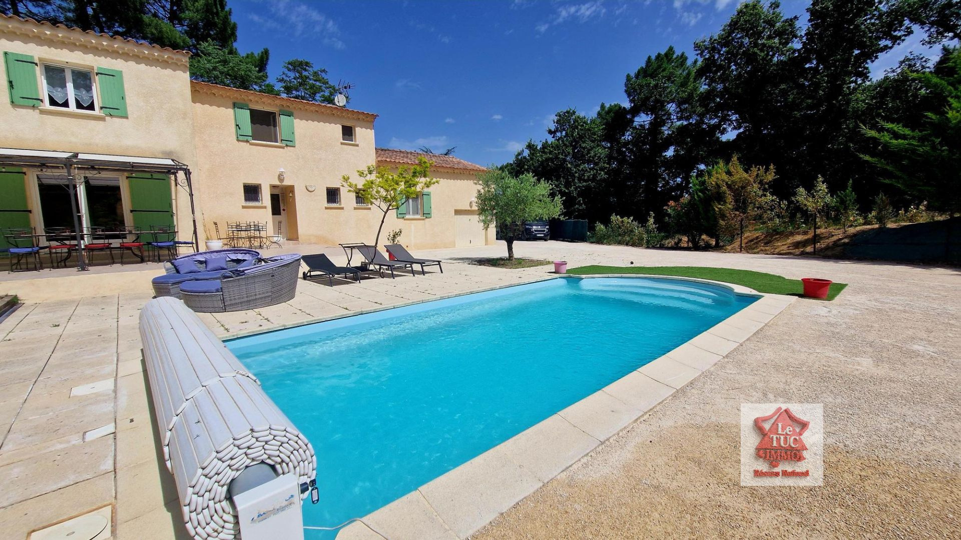 -coté extérieur : une grande terrasse avec en prolongement une belle piscine 7x4 avec arc roman et plages carrelées, un terrain de boules, un vaste espace pour le stationnement de plusieurs véhicules, un garage... Chaque espace a été pensé pour profiter pleinement de l'extérieur.