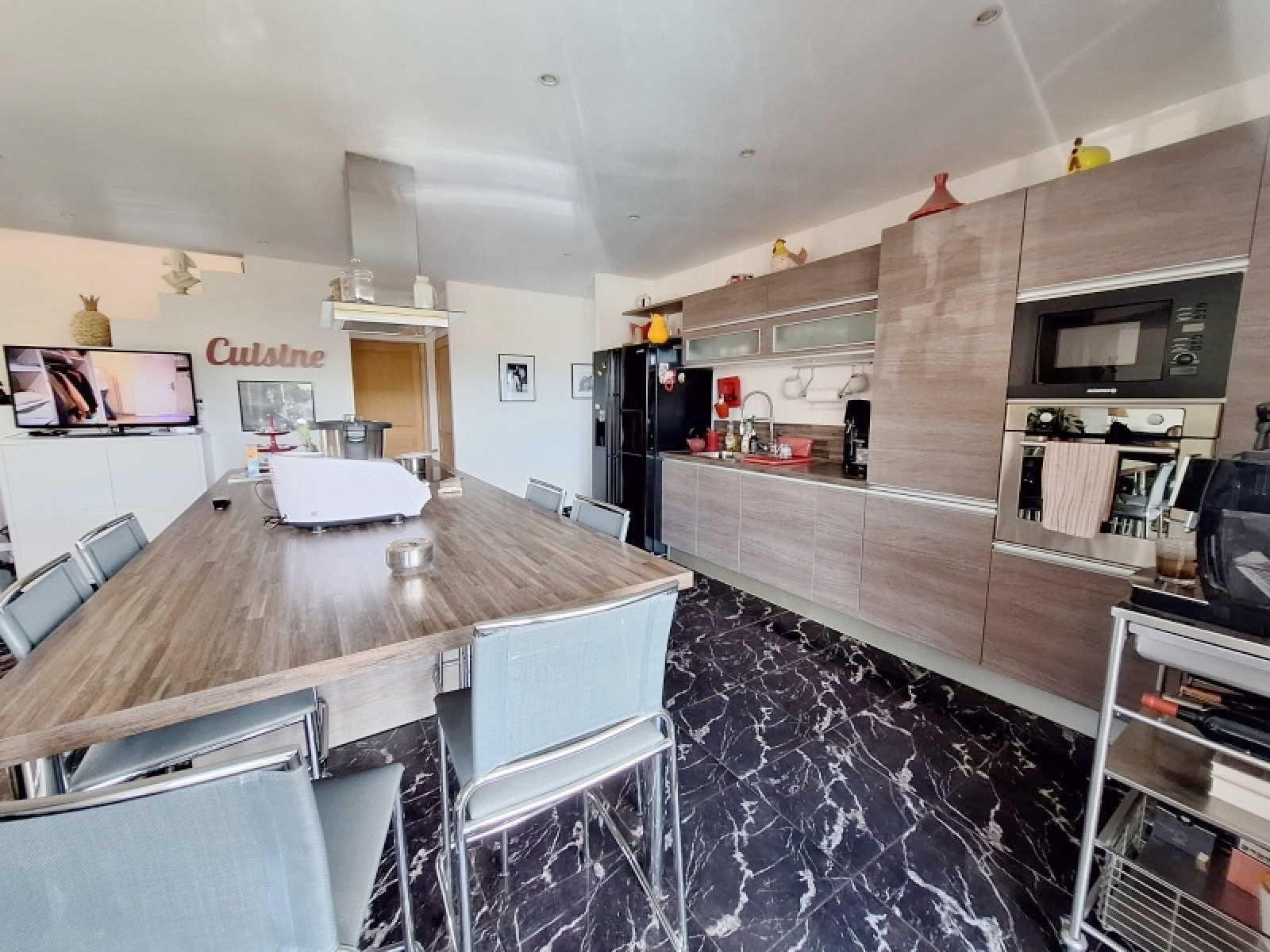 Le rez-de-chaussée fait 210 m² et se compose d'un spacieux séjour lumineux de 100 m² avec sa cuisine U.S entièrement équipée (hotte, lave-vaisselle, réfrigérateur…) ouvert sur une vaste terrasse, deux chambres avec placards encastrés, une salle de bains avec un balnéo double, un dressing, ainsi que deux WC, dont un visiteurs. Un garage de 38 m² complète ce niveau, avec possibilité de l’aménager en studio indépendant.