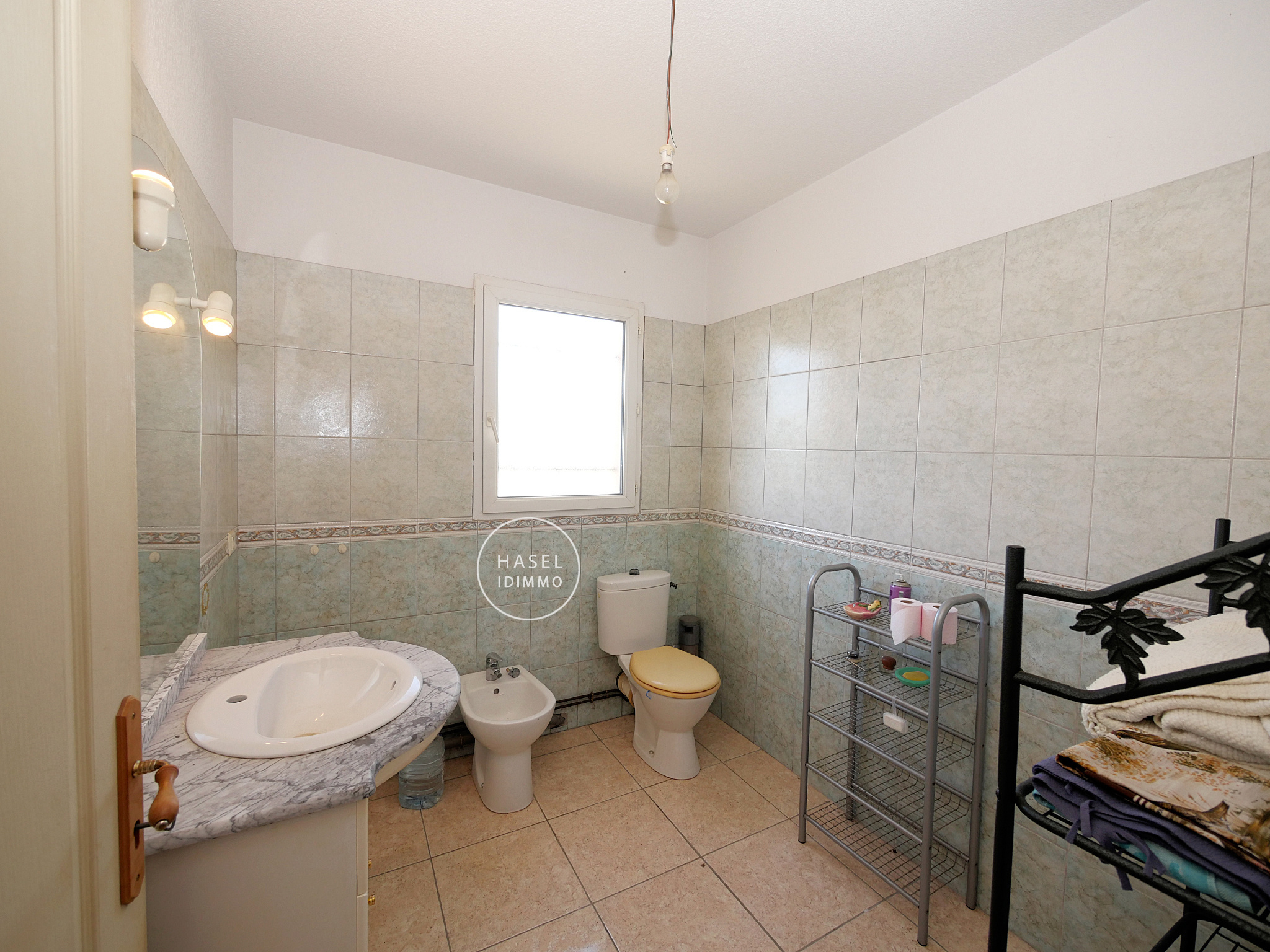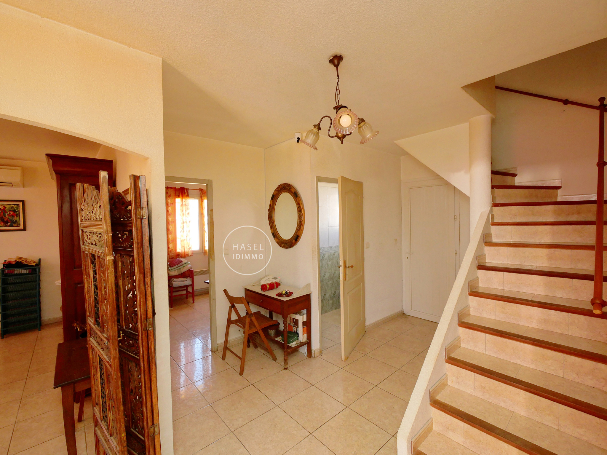 Au rez de chaussée, le salon climatisé, ouvert sur la véranda et le jardin, communique avec la cuisine, un bureau, un WC séparé et une partie nuit (une chambre, salle d’eau).