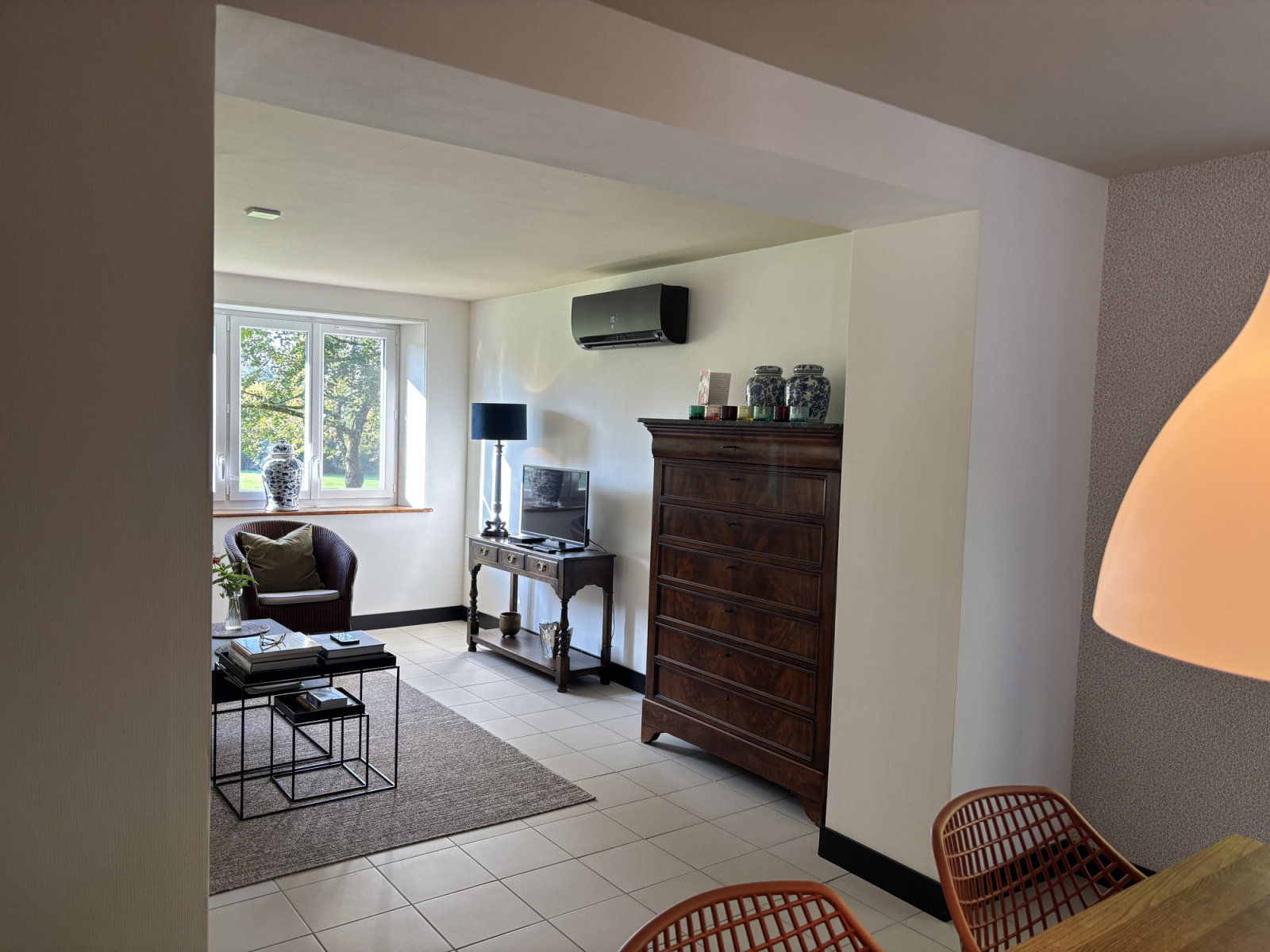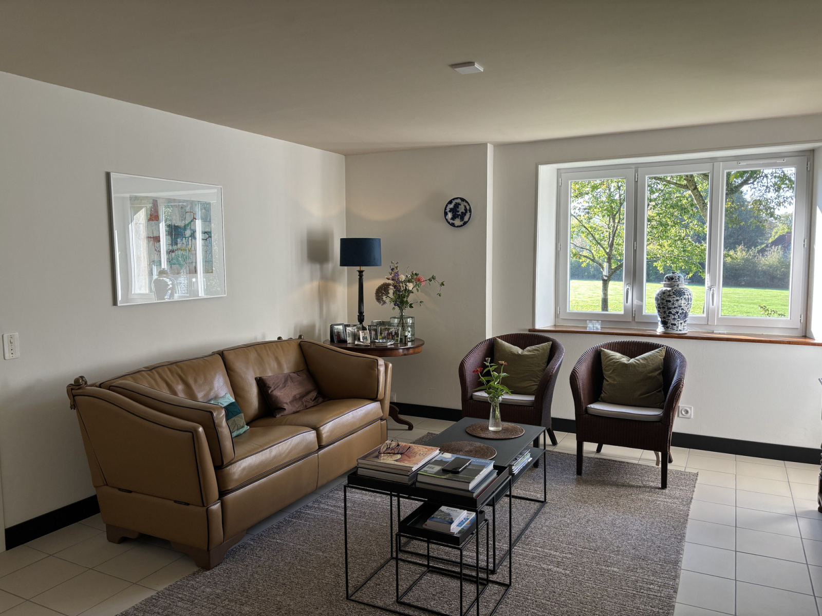 Depuis la salle à manger, vous accédez au salon, également équipé d'une climatisation (refroidissement/chauffage) et d'une grande fenêtre offrant une vue magnifique sur le pré privé.