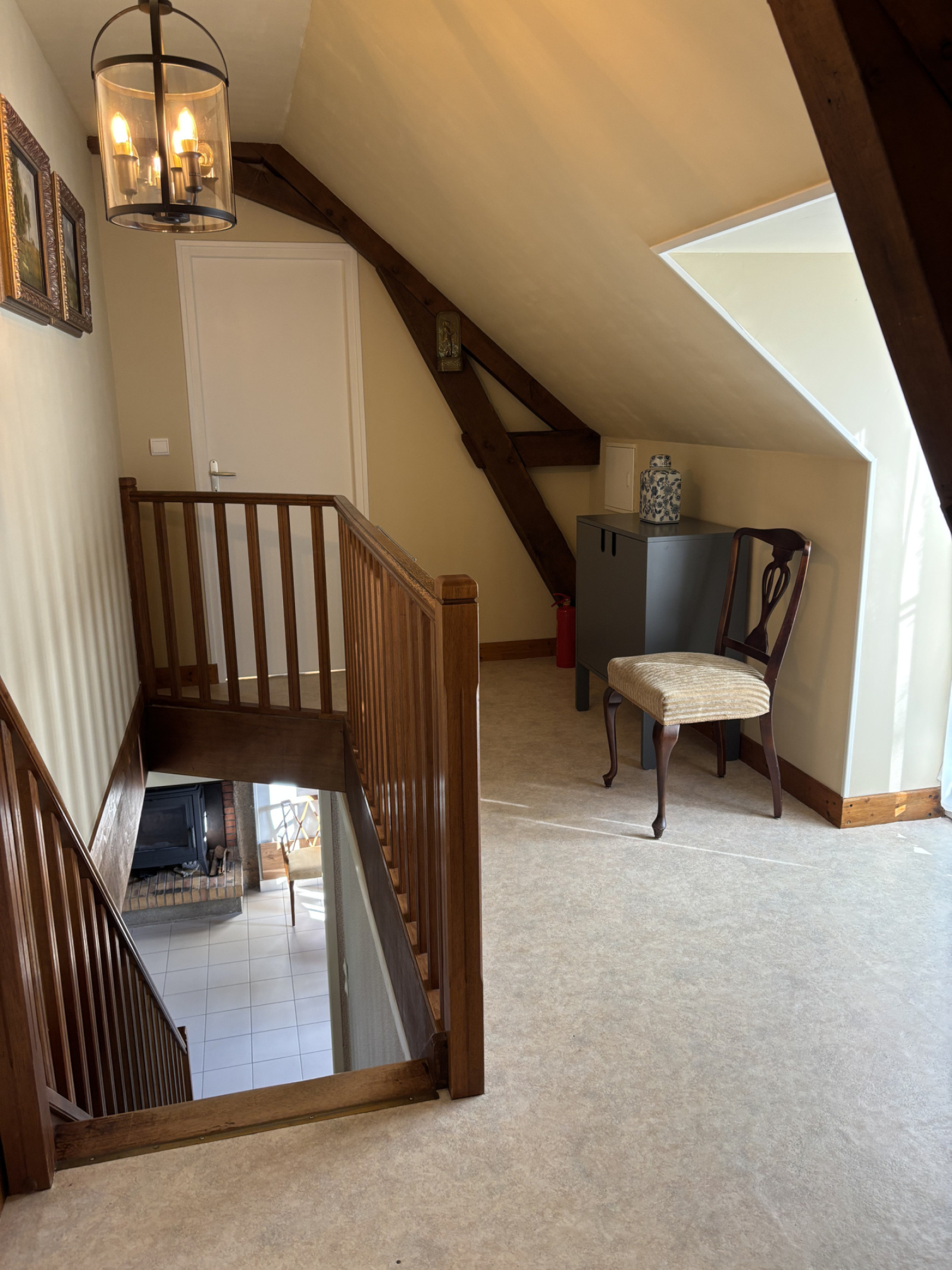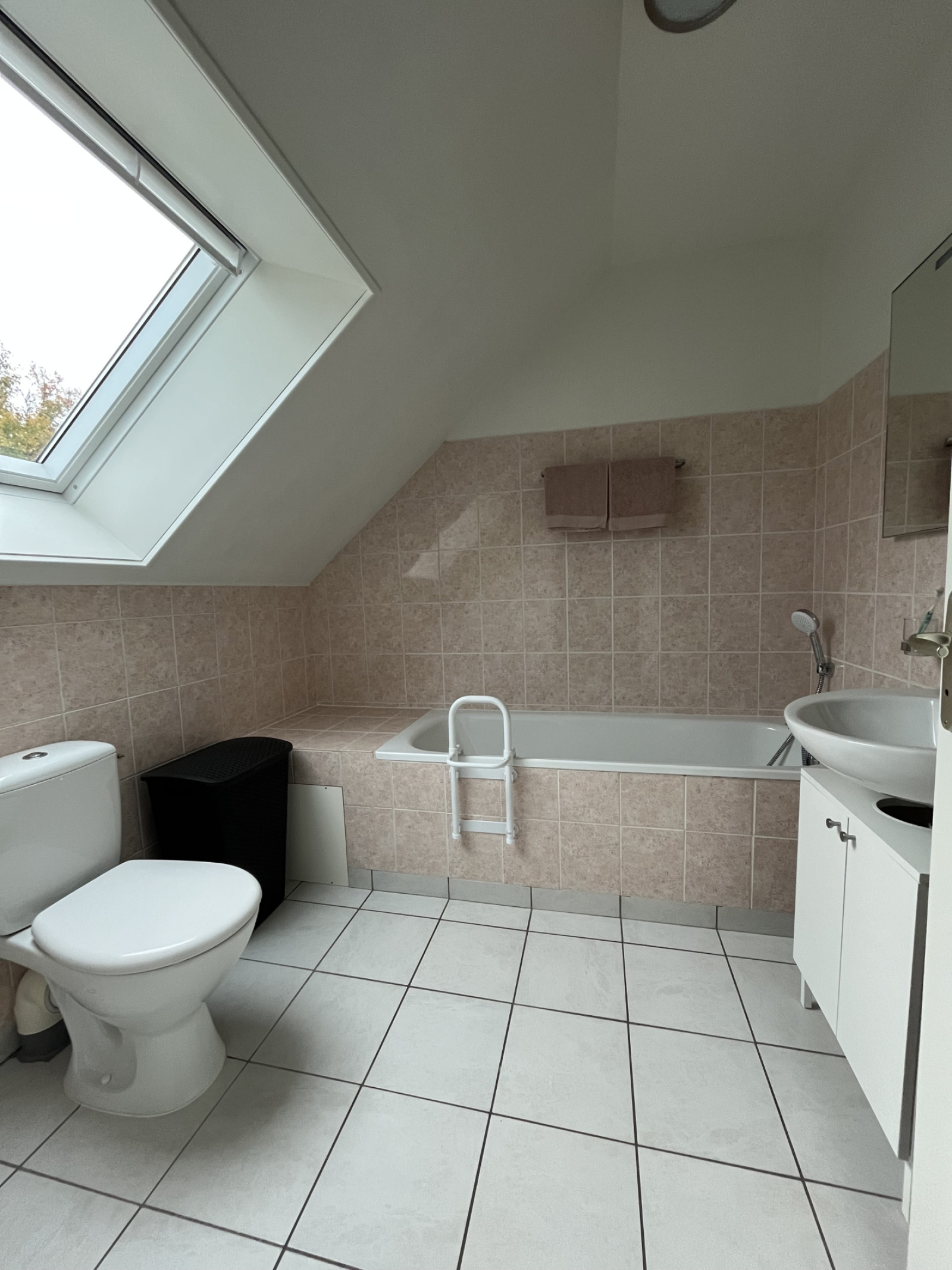 À l'étage supérieur se trouve un palier lumineux. Vous y trouverez la deuxième salle de bains avec baignoire, toilettes et lavabo. Il y a également trois chambres spacieuses, toutes agréablement lumineuses.