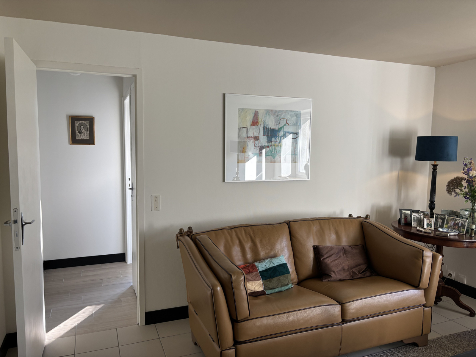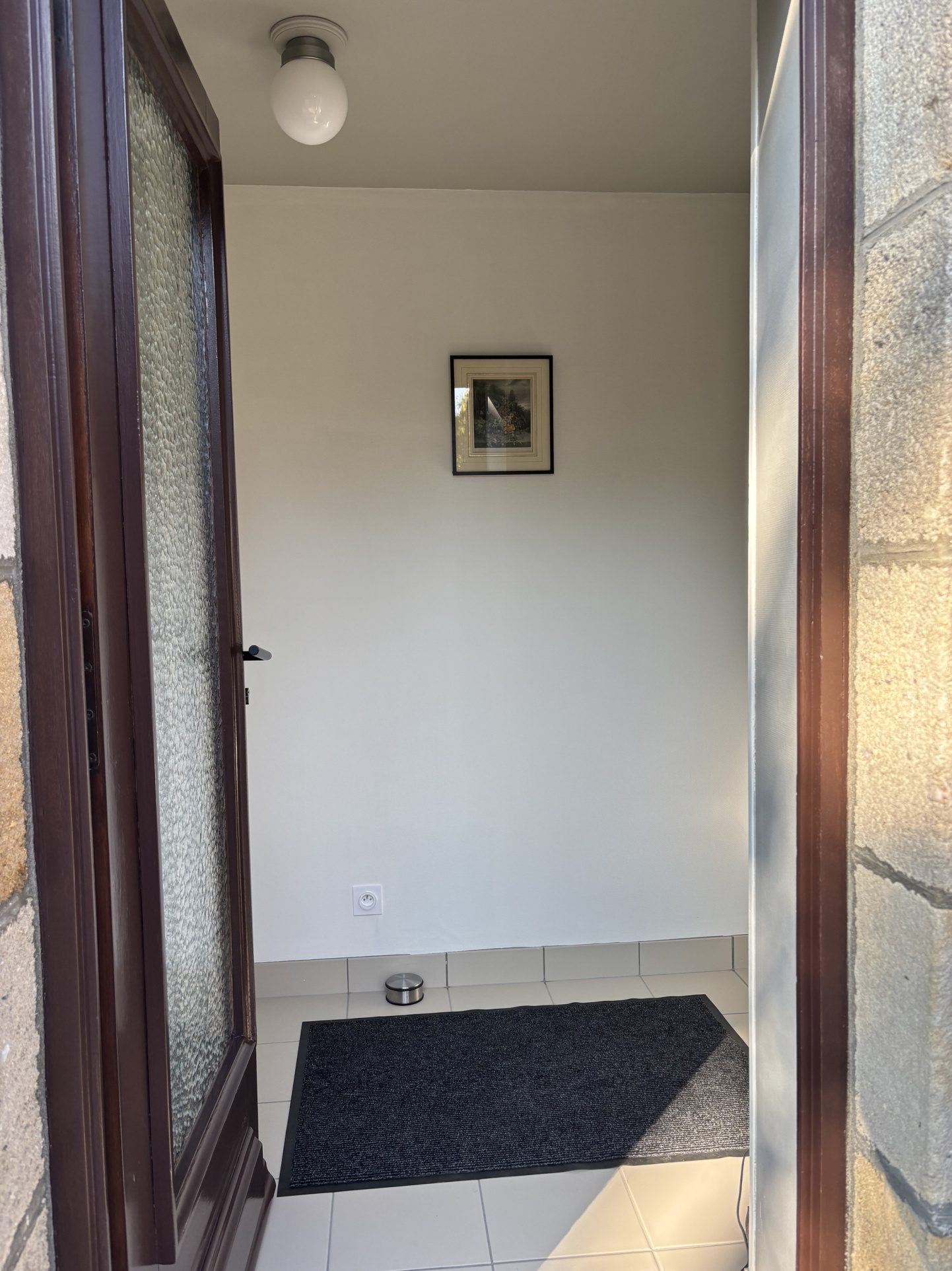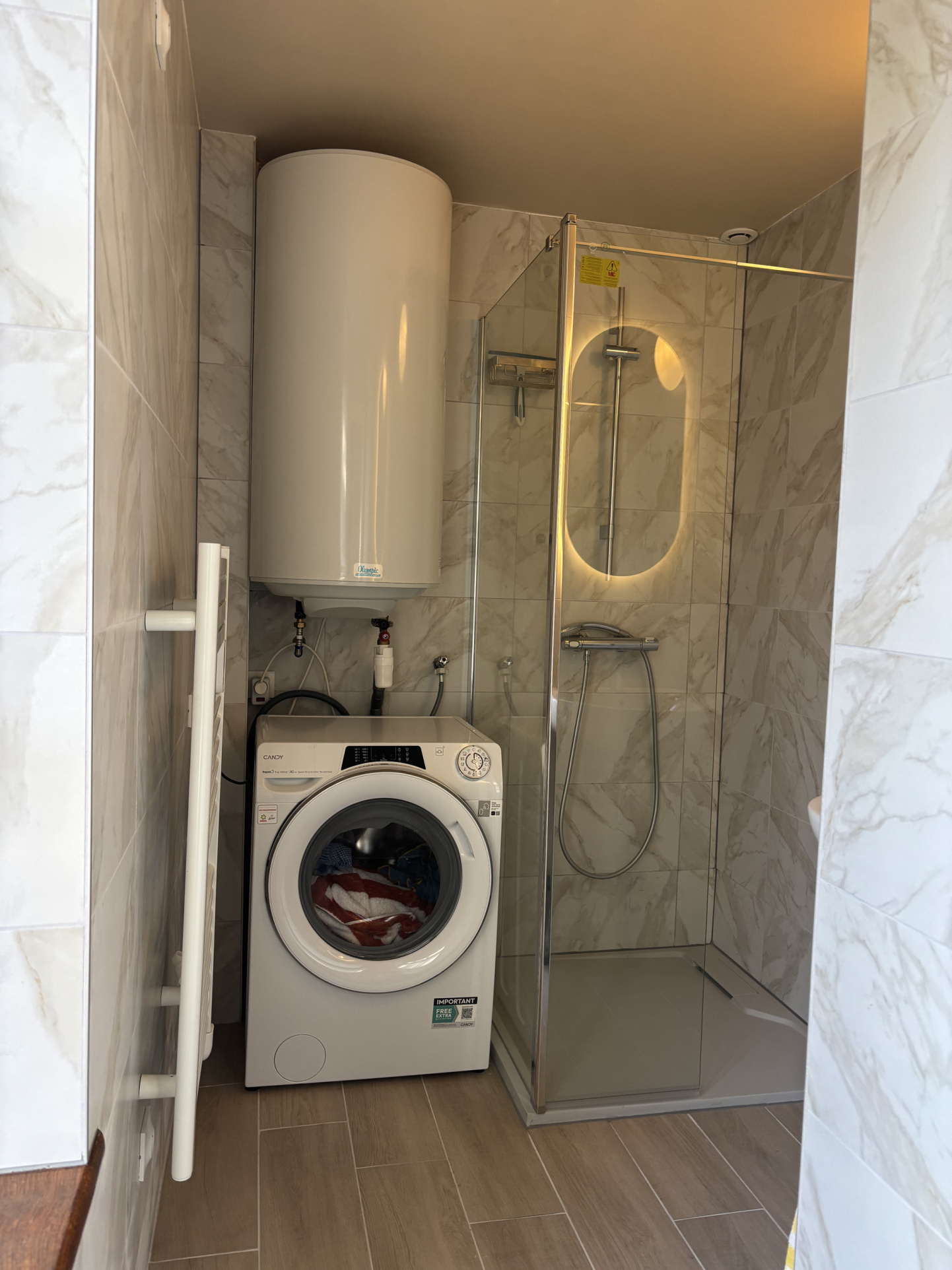 Une porte du salon mène à un petit hall avec des toilettes séparées et la première salle d’eau, équipée d'une douche, d'un lavabo, d'un radiateur sèche-serviettes, d'un raccordement pour la machine à laver et d'un chauffe-eau.