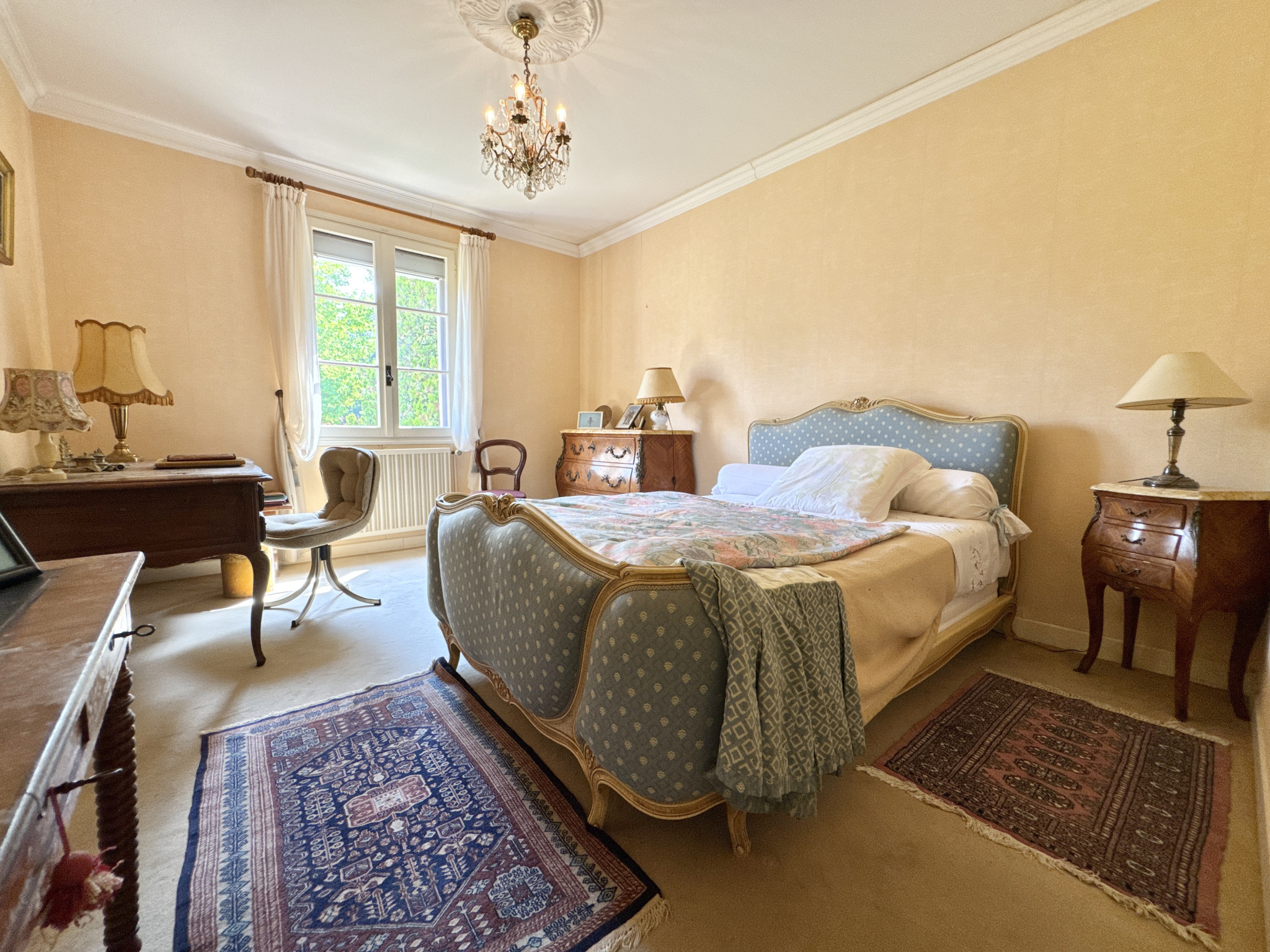 Un grand couloir dessert une cuisine séparée de 7,80 m², WC indépendant, une première chambre de 15 m² avec grands placards, une seconde chambre de 10,60 m² également avec placards, une salle de bain avec douche et baignoire de 6,90 m², une troisième chambre de 16,36 m² en suite avec salle de bain attenante et WC de 8 m², une quatrième chambre de 12,60 m² et, à l’étage, une chambre d’amis de 15 m².