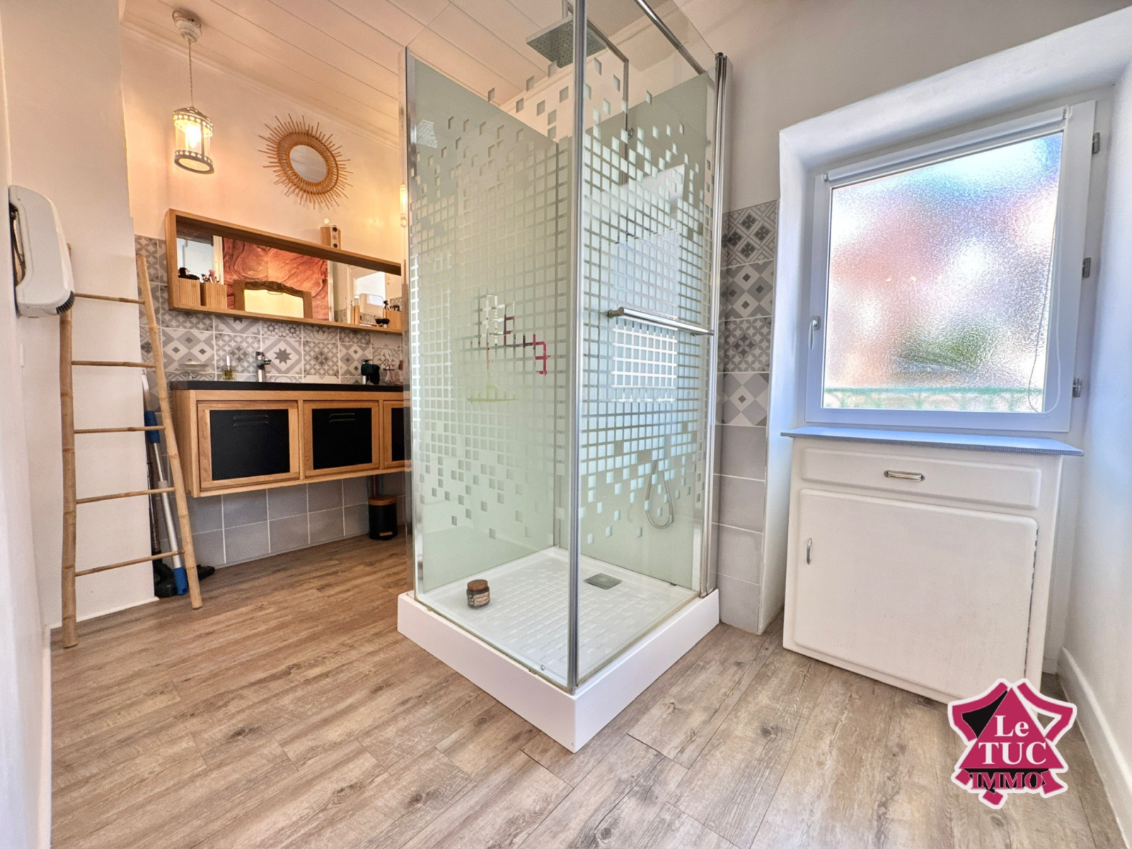 À l’étage, une première chambre confortable de 17,40 m² avec salle d’eau équipée d’une double vasque et d’une cabine de douche.