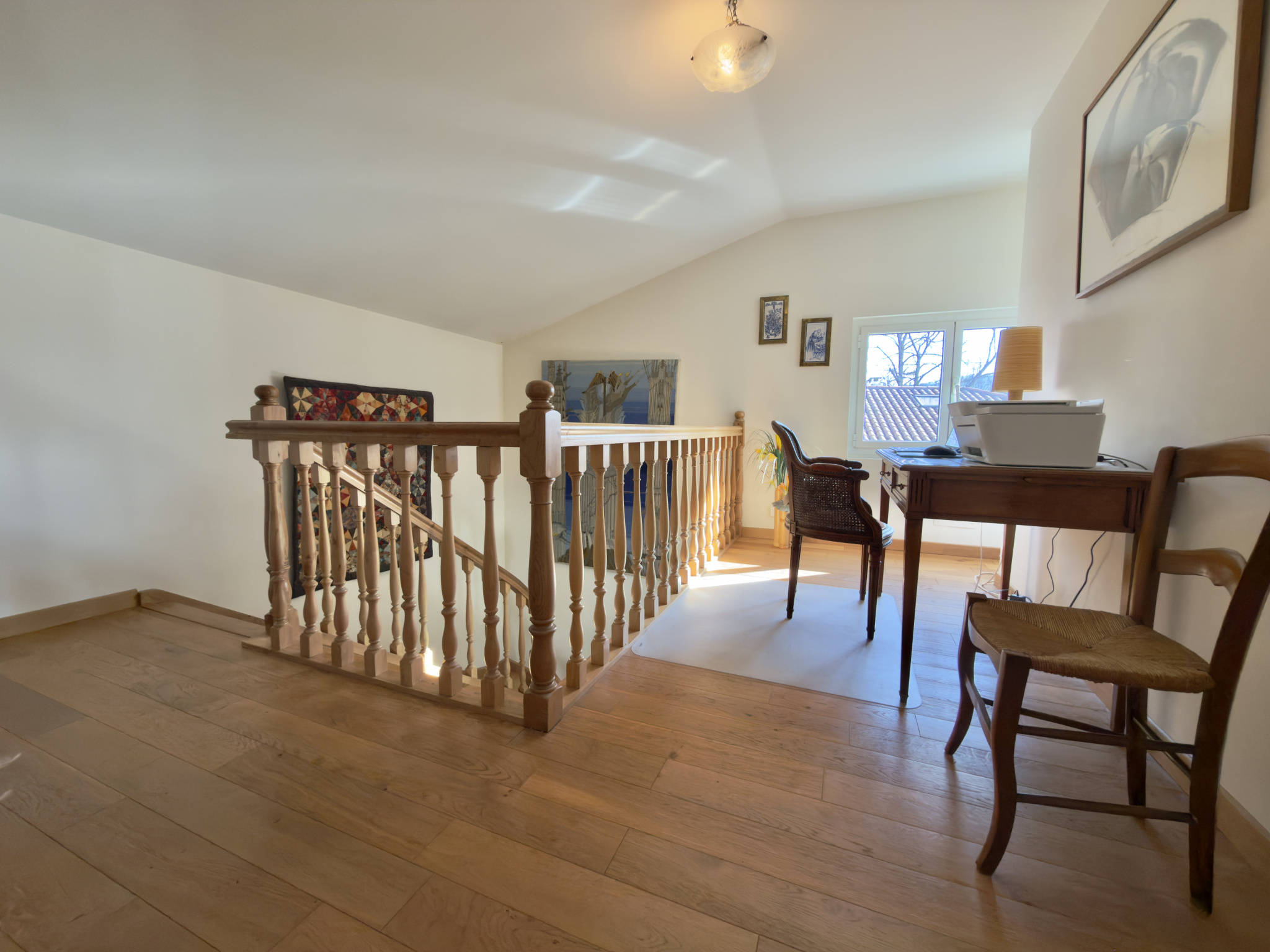 À l’étage, deux chambres supplémentaires : une première de 23,24 m² équipée d’une climatisation réversible, une seconde de 12,68 m², un espace mezzanine bureau de 12,42 m², salle de bain attenante de 7,30 m² avec baignoire, vasque et WC.