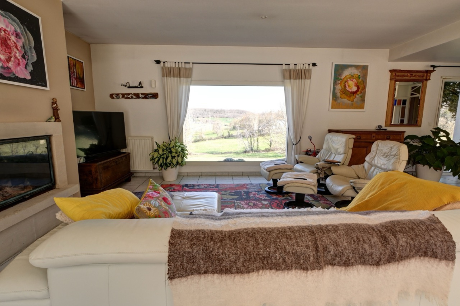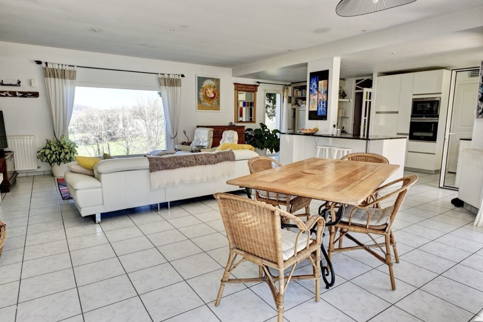 Entrée sur salon, séjour, cuisine ouverte américaine de 65 m² avec de grandes baies vitrées traversantes, baignée de lumière avec un joli insert à bois.