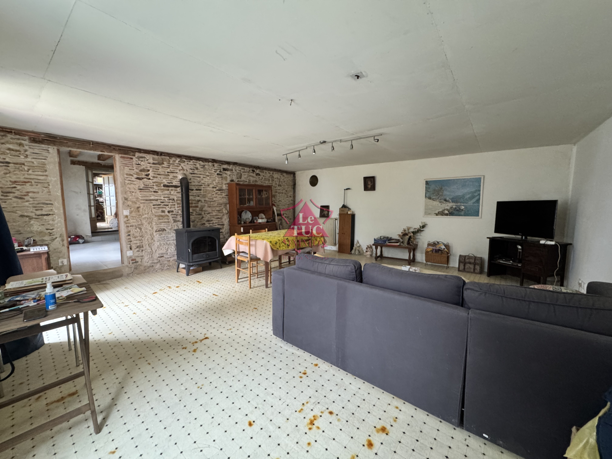 La maison est composée de : entrée, cuisine équipée, salon avec un poêle à bois, une grande chambre de 22 m², salle d’eau, WC, une buanderie, une chaufferie, une pièce de 40 m² à rénover. Une dépendance de 66 m², un garage, un préau.